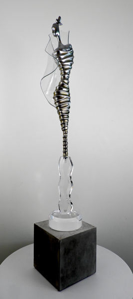 Despite the countless creatures we share in this earth, we have a need to shape our own imagination into differen¬t beings we can form and enjoy. My sculpture Sea Creature #1 is an example of an aquatic imaginary creature emerging from the deep underwater. It is made in aluminum and clear acrylic and represents a fanciful creation of the deep mental layer called imagination.