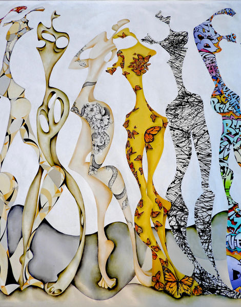 “Moods” is a large canvas that celebrates the emotional complexion, the temporary state of mind of women such as feeling romantic, gloomy, cheerful, whimsical, idyllic, humorous, and reflective.