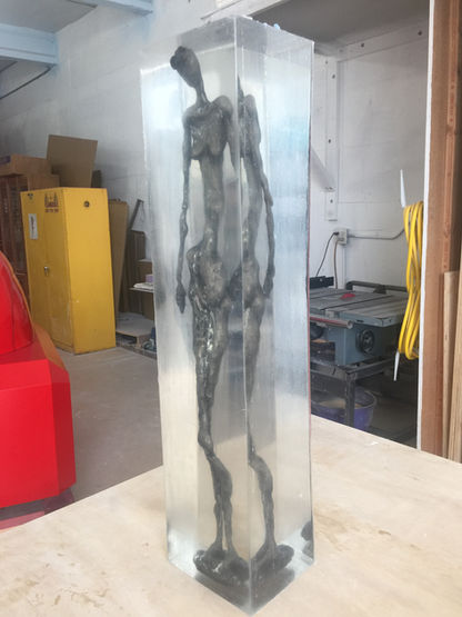 This bronze sculpture depicts a male figure encapsulated in a prism of clear resin. It represents the bubble of isolation of urban life; despite being surrounded by people in a city, the overwhelming nature of a city may cause isolation and loneliness.